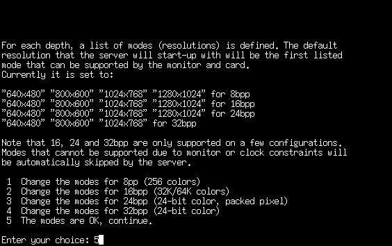 Now it's time to select the video modes that your X server will use. You will see four different color depths - 8bpp, 16bpp, 24bpp, and 32bpp. Each will have a listing of the various video modes that can be run at that color depth. When you start up X, it will enter a default color depth and run at the first resolution listed for that color depth. If you'd like X to start up in a different resolution by default, now is the time to do that.